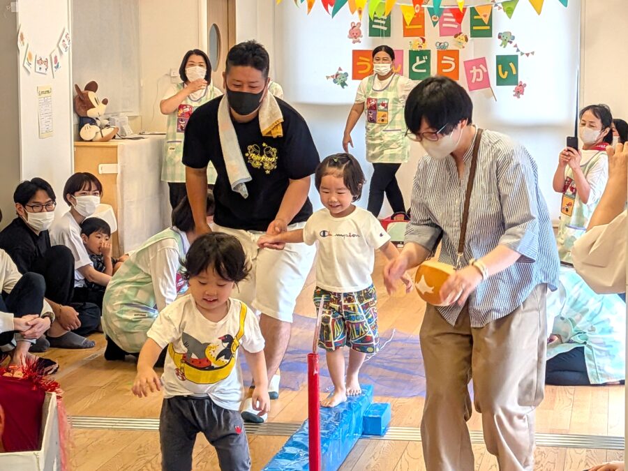 運動会が行われました。お父さん、お母さんが見守る中、子どもたちは緊張しながらも一生懸命に競技に参加していました。その成長した姿を見て「こんなことができるようになったの!」と保護者の喜びの声が聞こえてきました。
