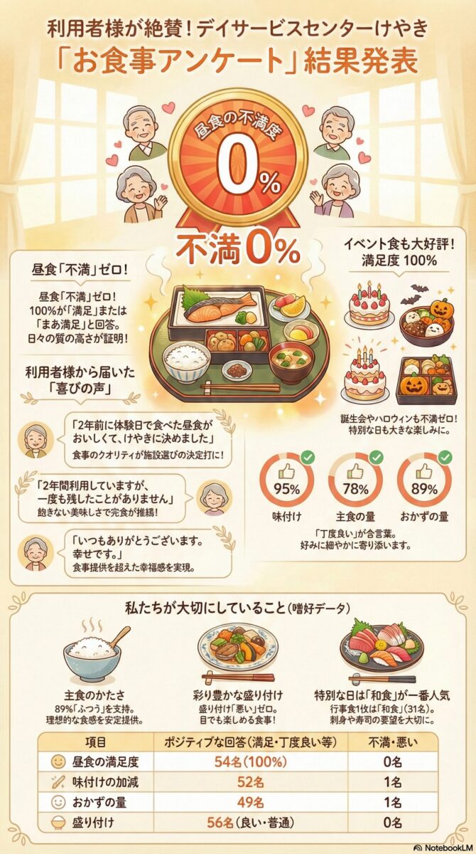 おかげさまで多くの方にご回答いただき、昼食の満足度や味付け、量について貴重なご意見を賜りました。今回の調査結果を真摯に受け止め、今後も皆様に心から喜んでいただける食事作りとサービスの改善に努めてまいります。