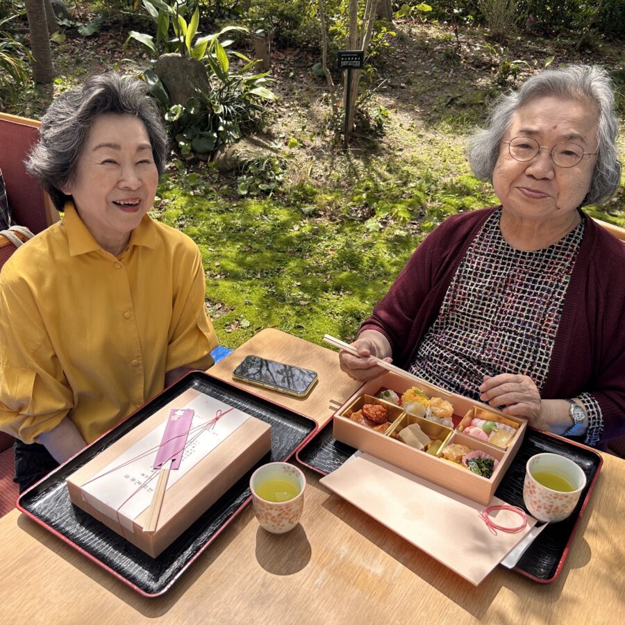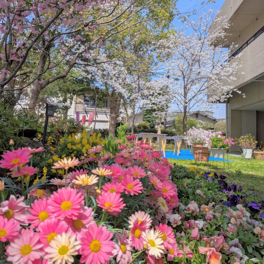 桜は満開、ご利用者の方が丹精に育てている花も見頃を迎え、くすの木のお庭で花見が行われました。本日は花見弁当。たけのこの天ぷらや豆ごはんなど、見た目もかわいく春を感じながらのお食事は、とても贅沢なひとときでした。